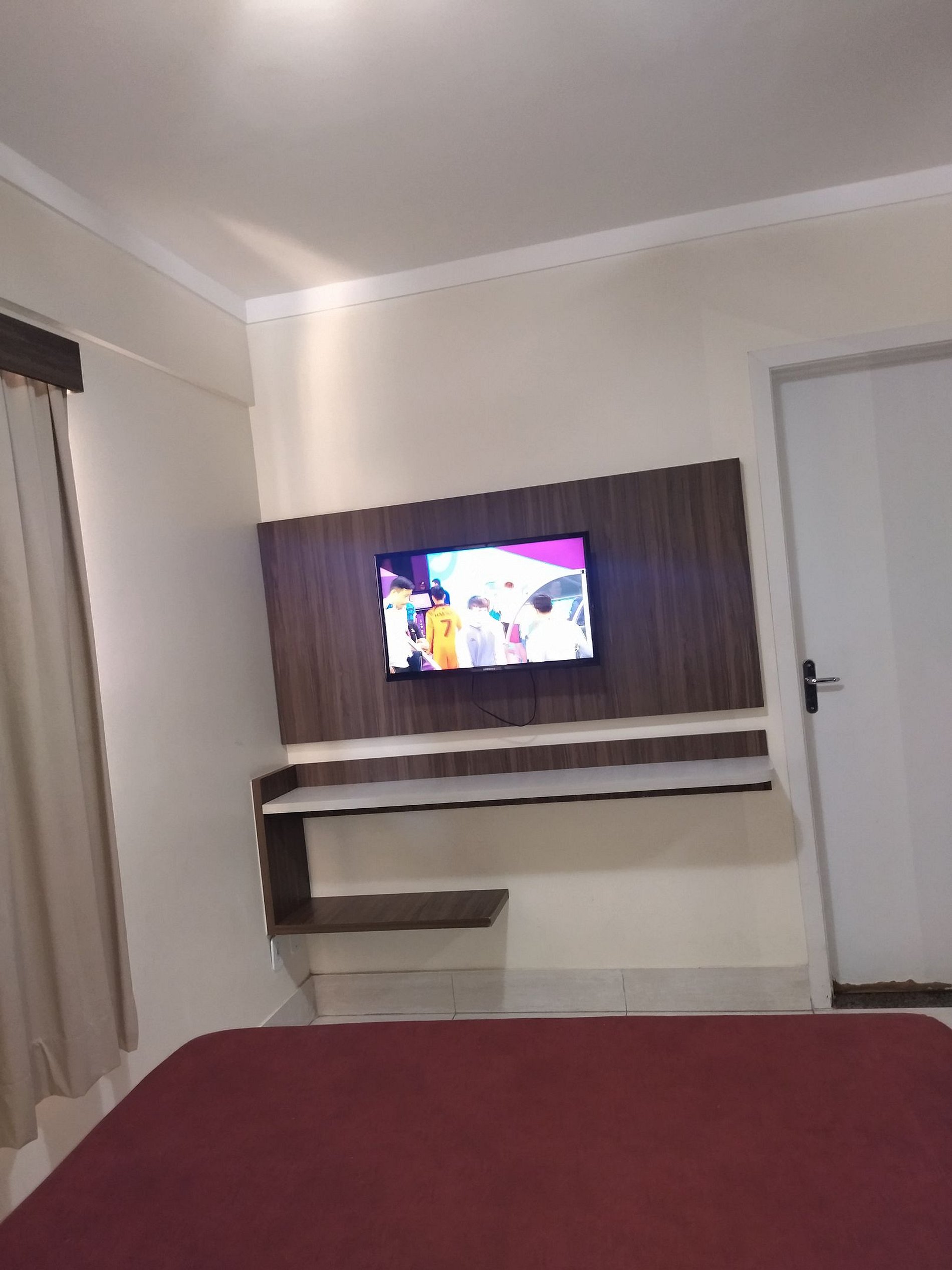 Sala com cama de casal, TV e ventilador de teto. Banheiro social. Frigobar e micro-ondas.