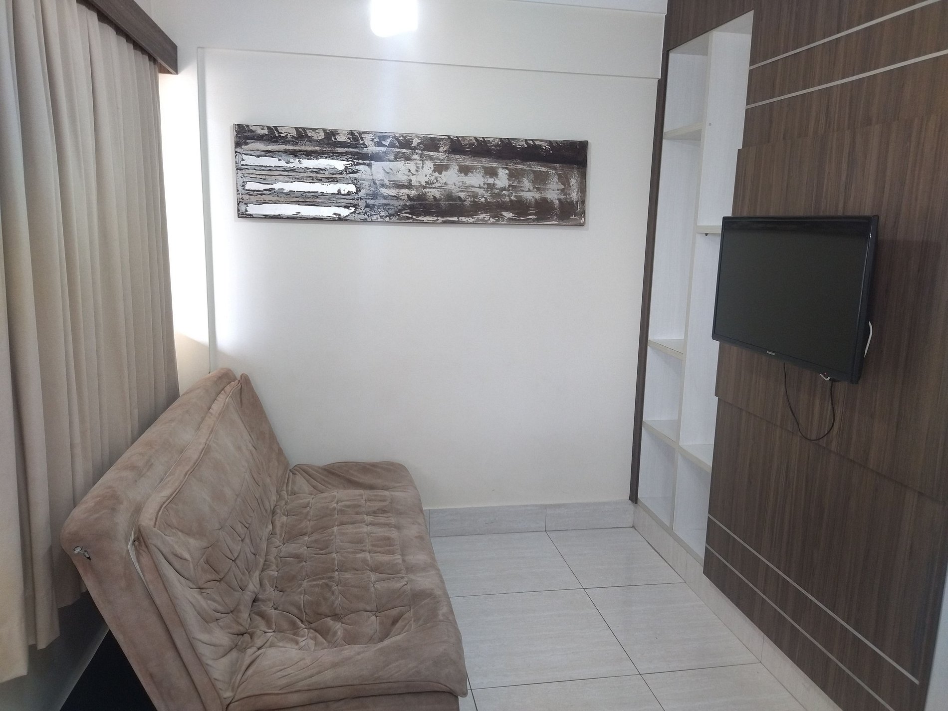 Sala com cama de casal, TV e ventilador de teto. Banheiro social. Frigobar e micro-ondas.