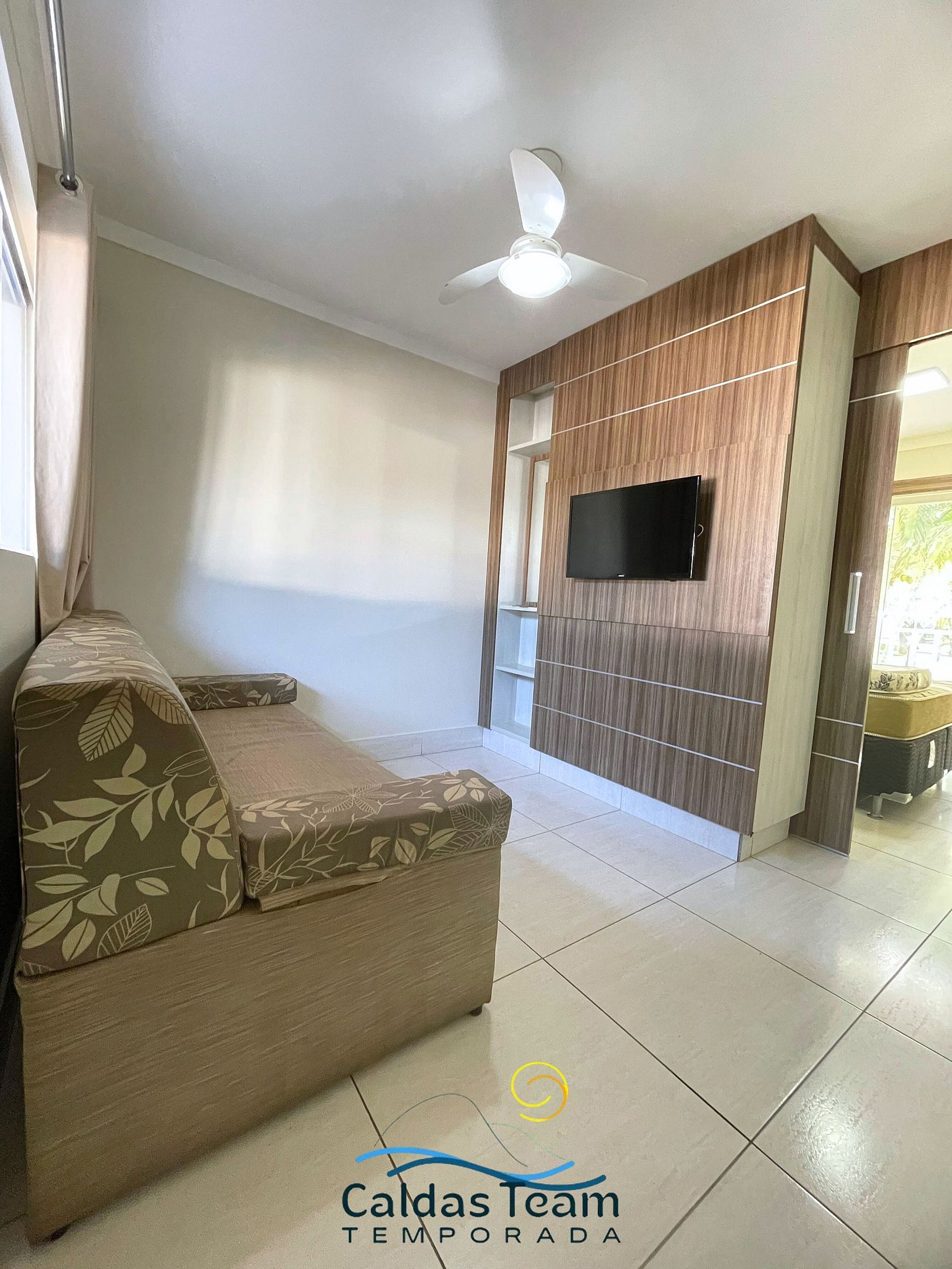 Sala com cama de casal, TV e ventilador de teto. Banheiro social. Frigobar e micro-ondas.