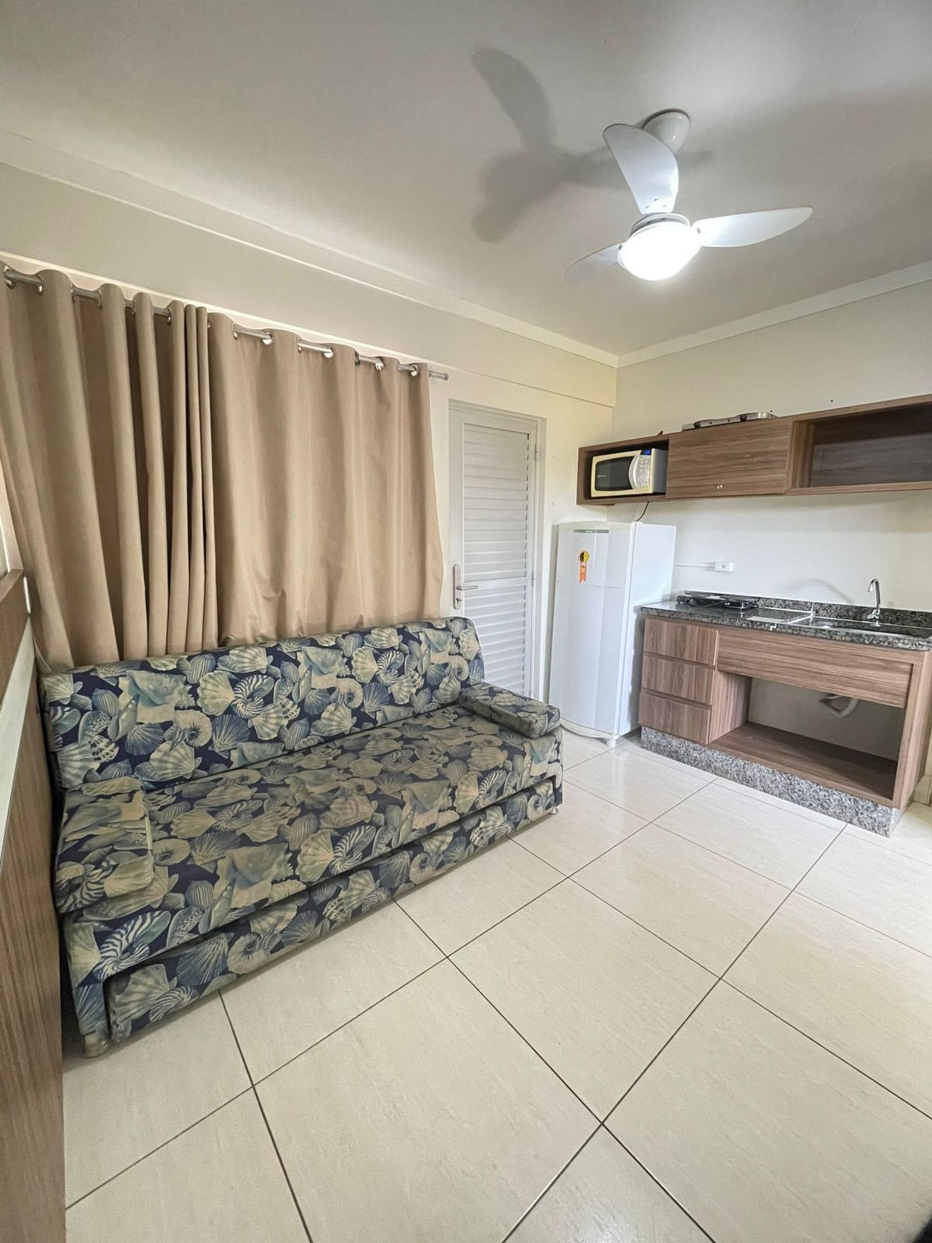 Sala com cama de casal, TV e ventilador de teto. Banheiro social. Frigobar e micro-ondas.