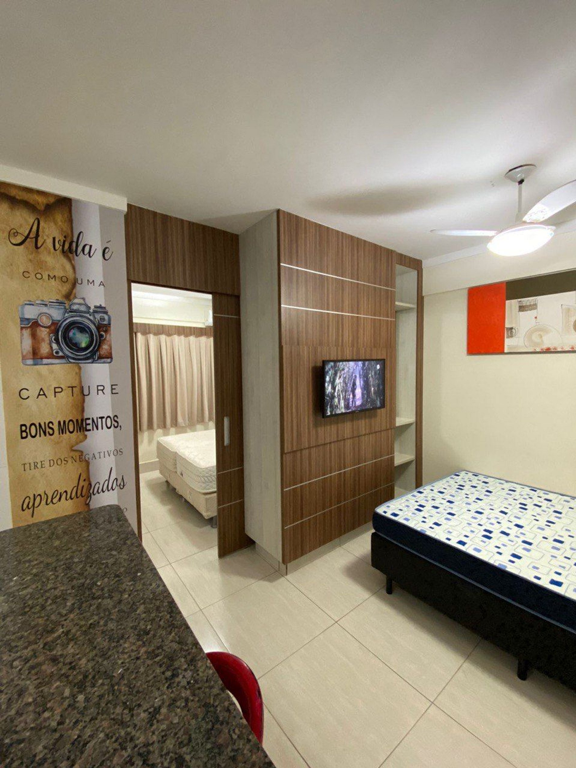 Apartamento aconchegante de 1 quarto contendo, suíte de casal com ar condicionado, TV e guarda roupa, 1 colchão extra de solteiro.
