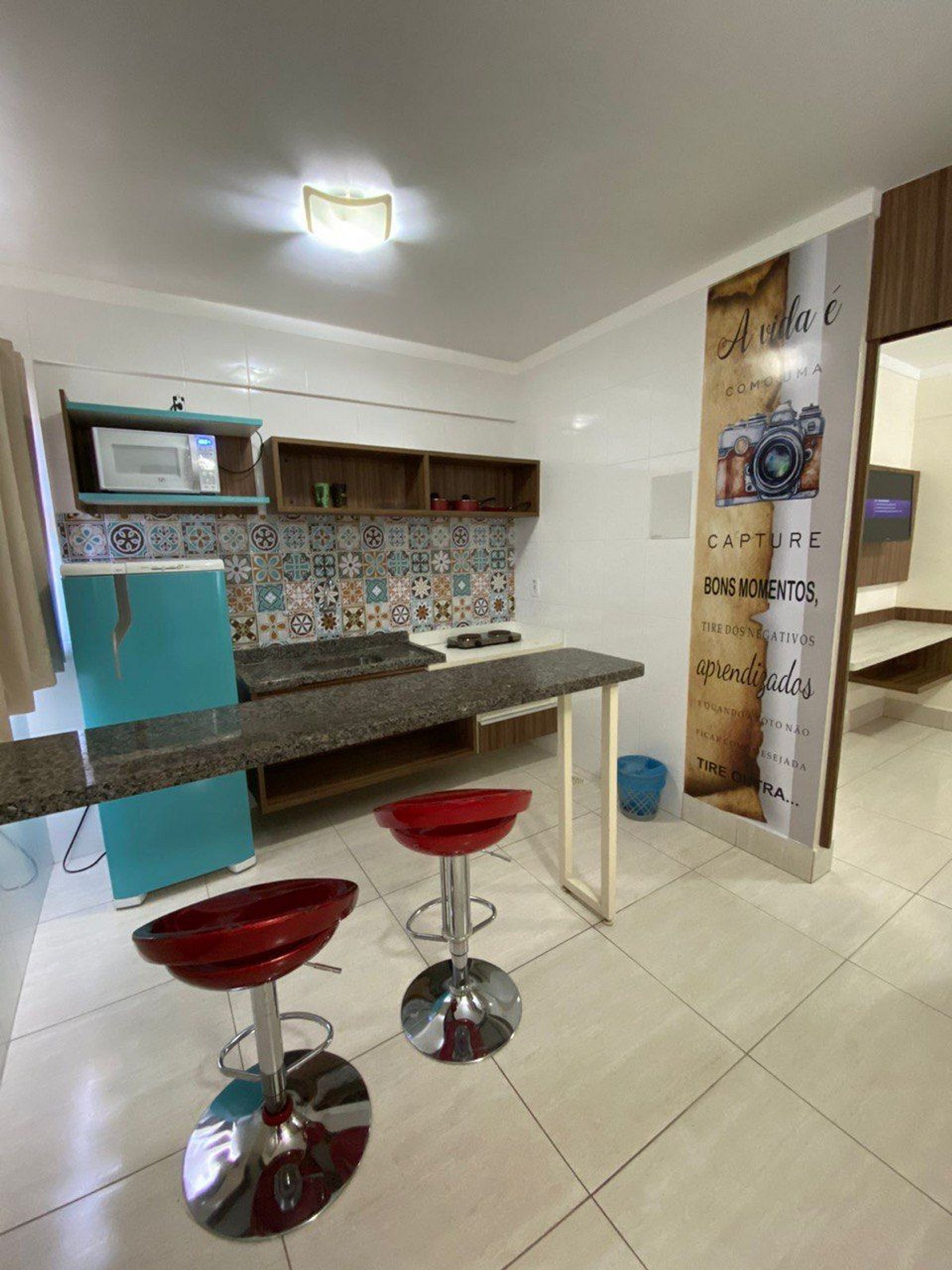 Sala com cama de casal, TV e ventilador de teto. Banheiro social. Frigobar e micro-ondas.