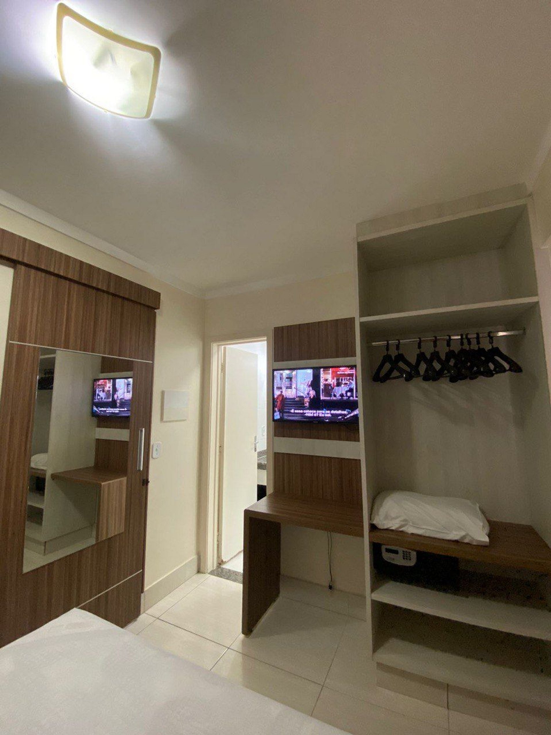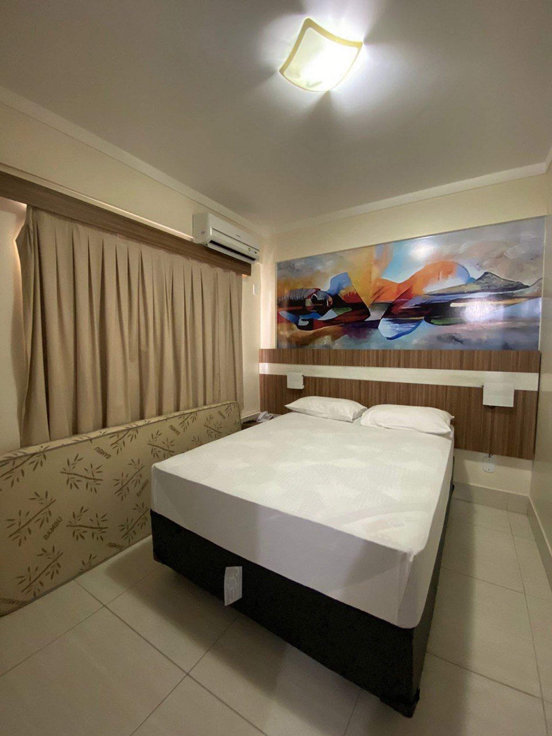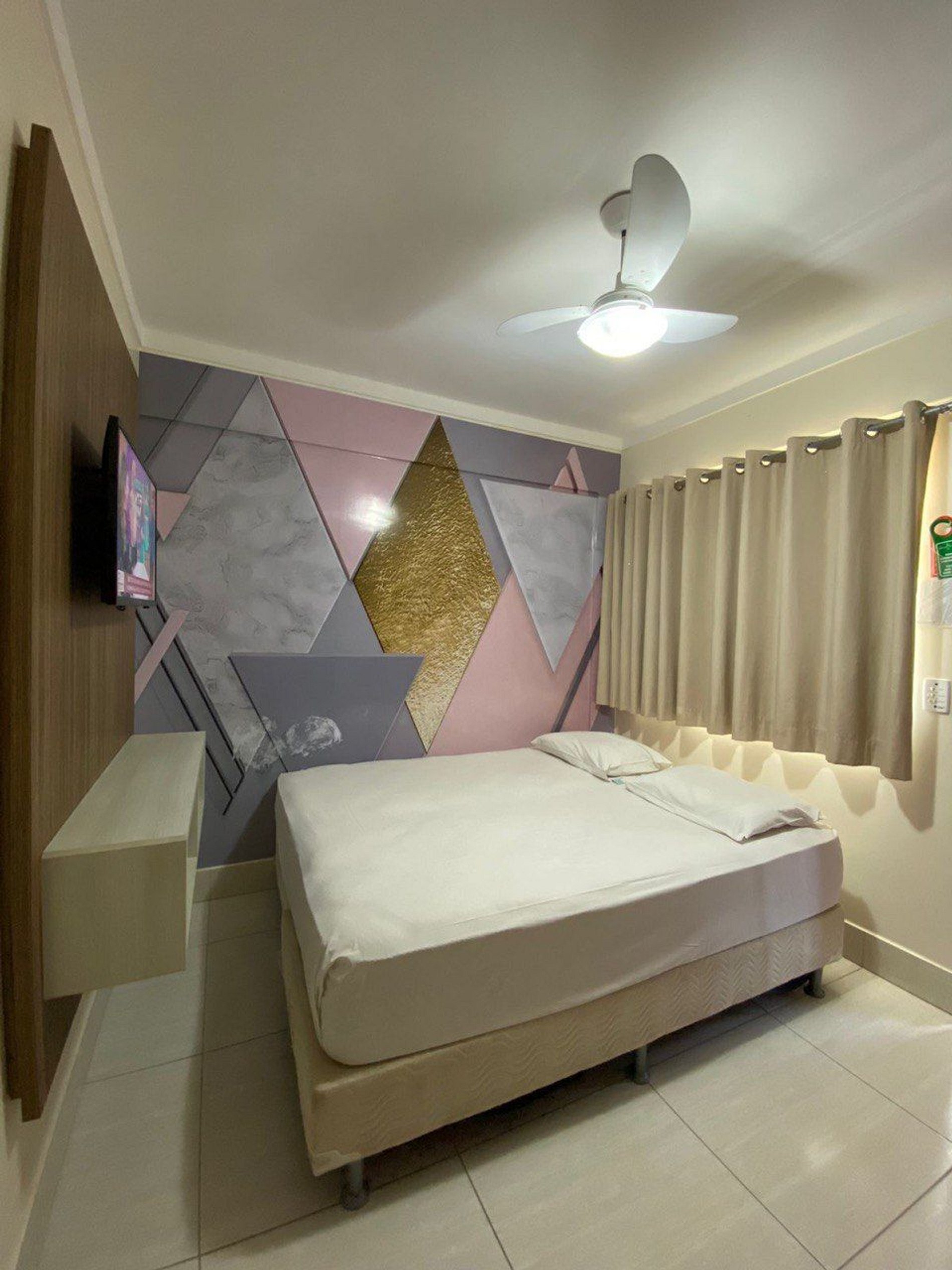 Sala com cama de casal, TV e ventilador de teto. Banheiro social. Frigobar e micro-ondas.