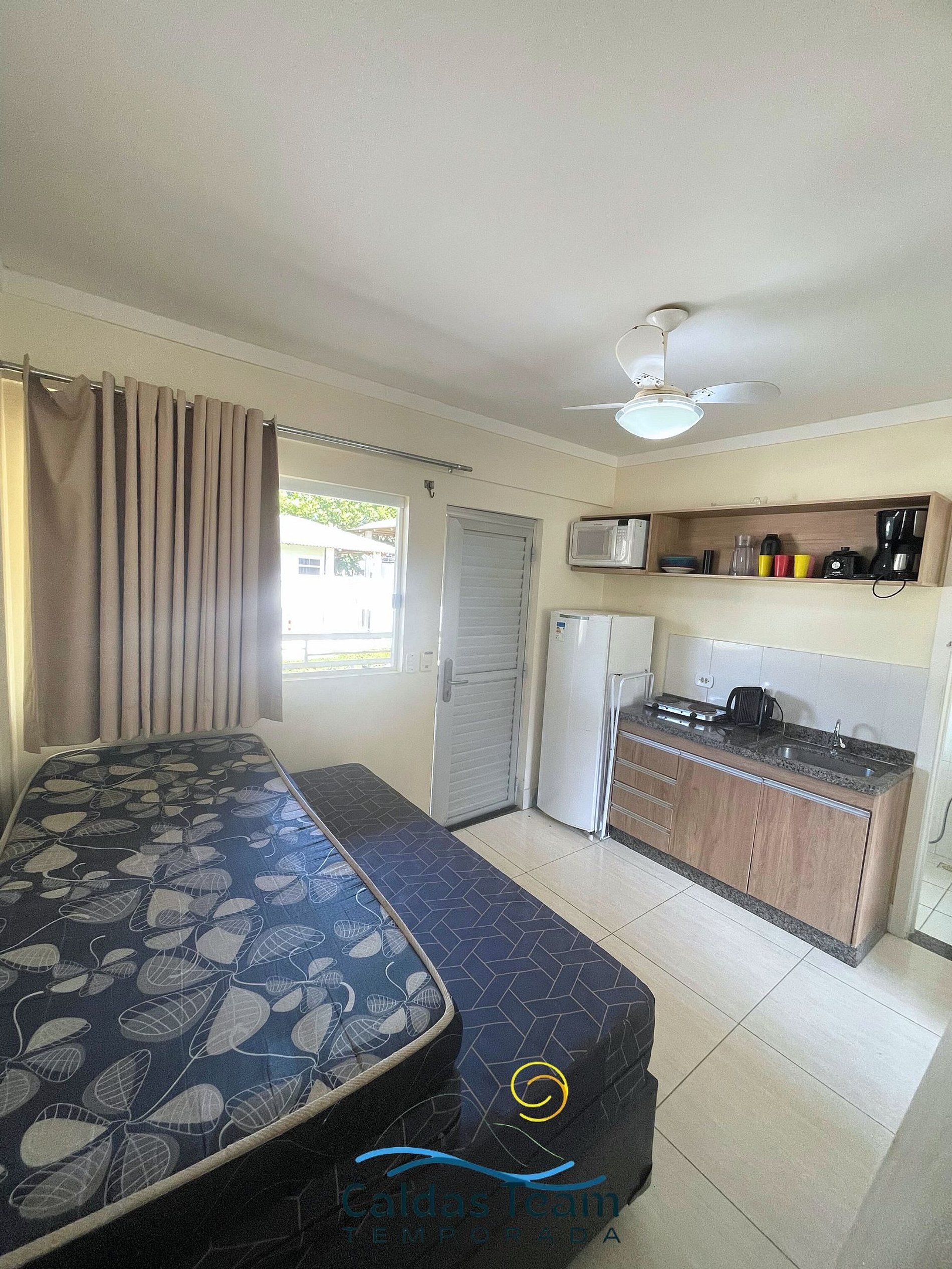 Sala com cama de casal, TV e ventilador de teto. Banheiro social. Frigobar e micro-ondas.
