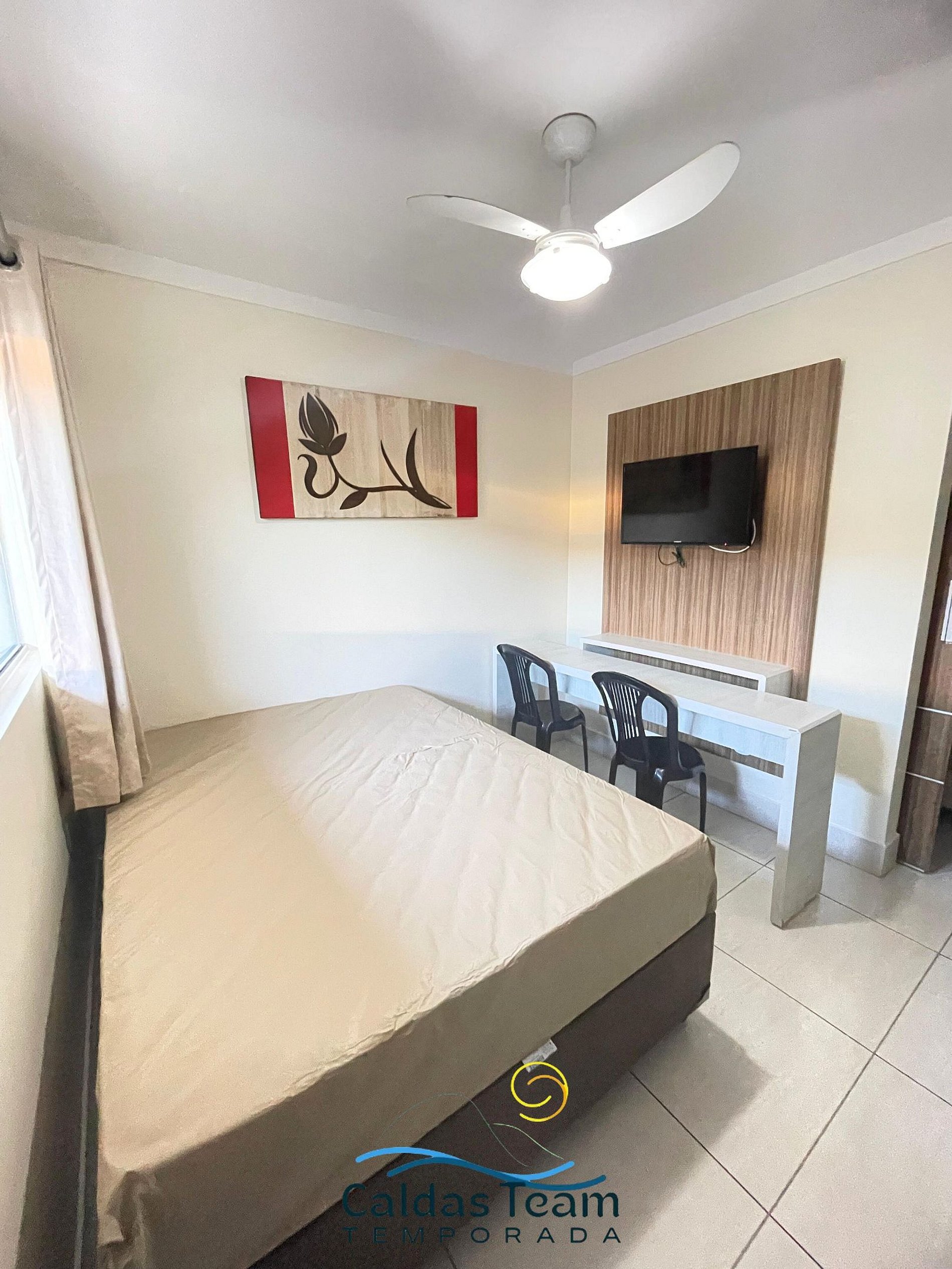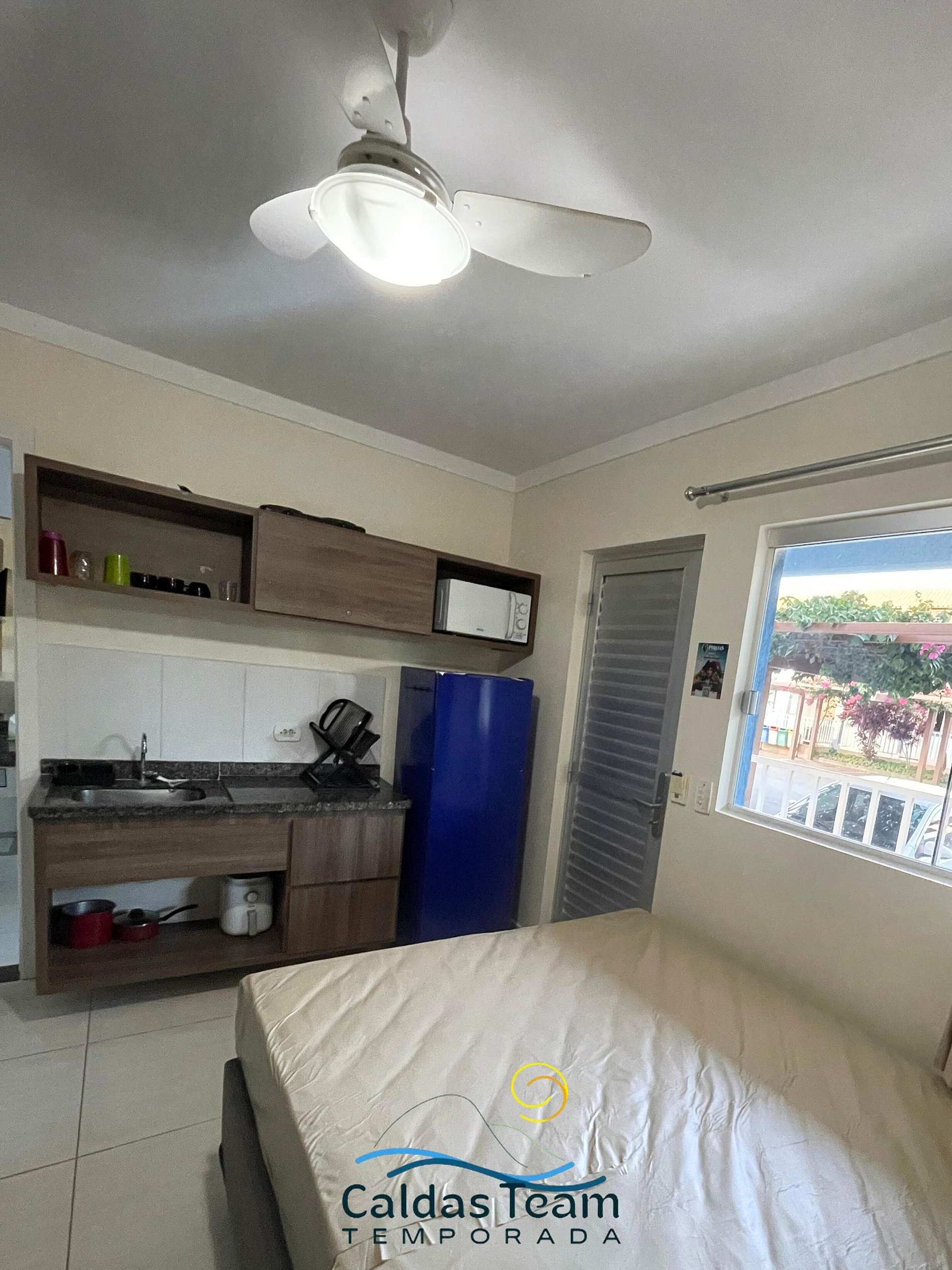 Sala com cama de casal, TV e ventilador de teto. Banheiro social. Frigobar e micro-ondas.