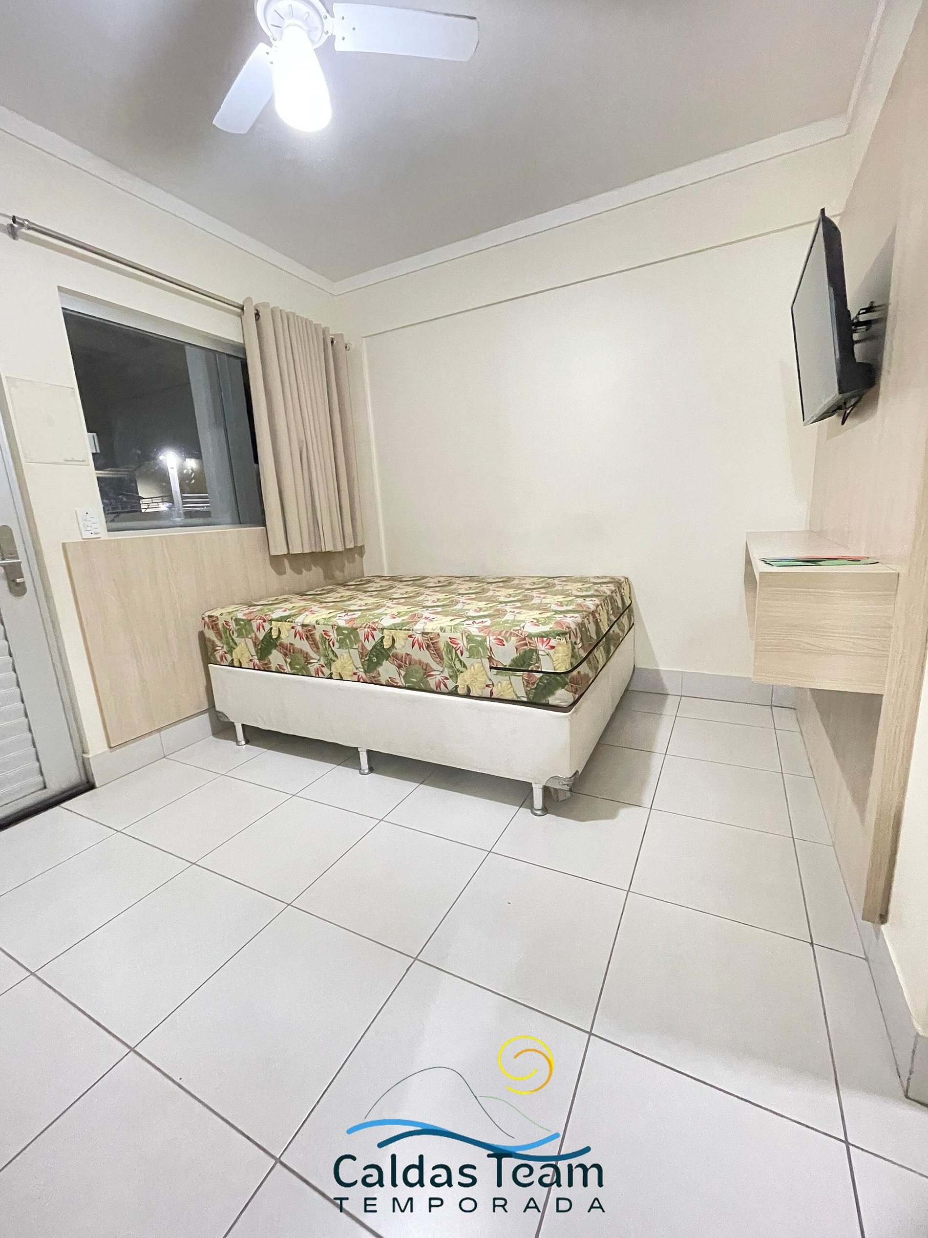 Sala com cama de casal, TV e ventilador de teto. Banheiro social. Frigobar e micro-ondas.