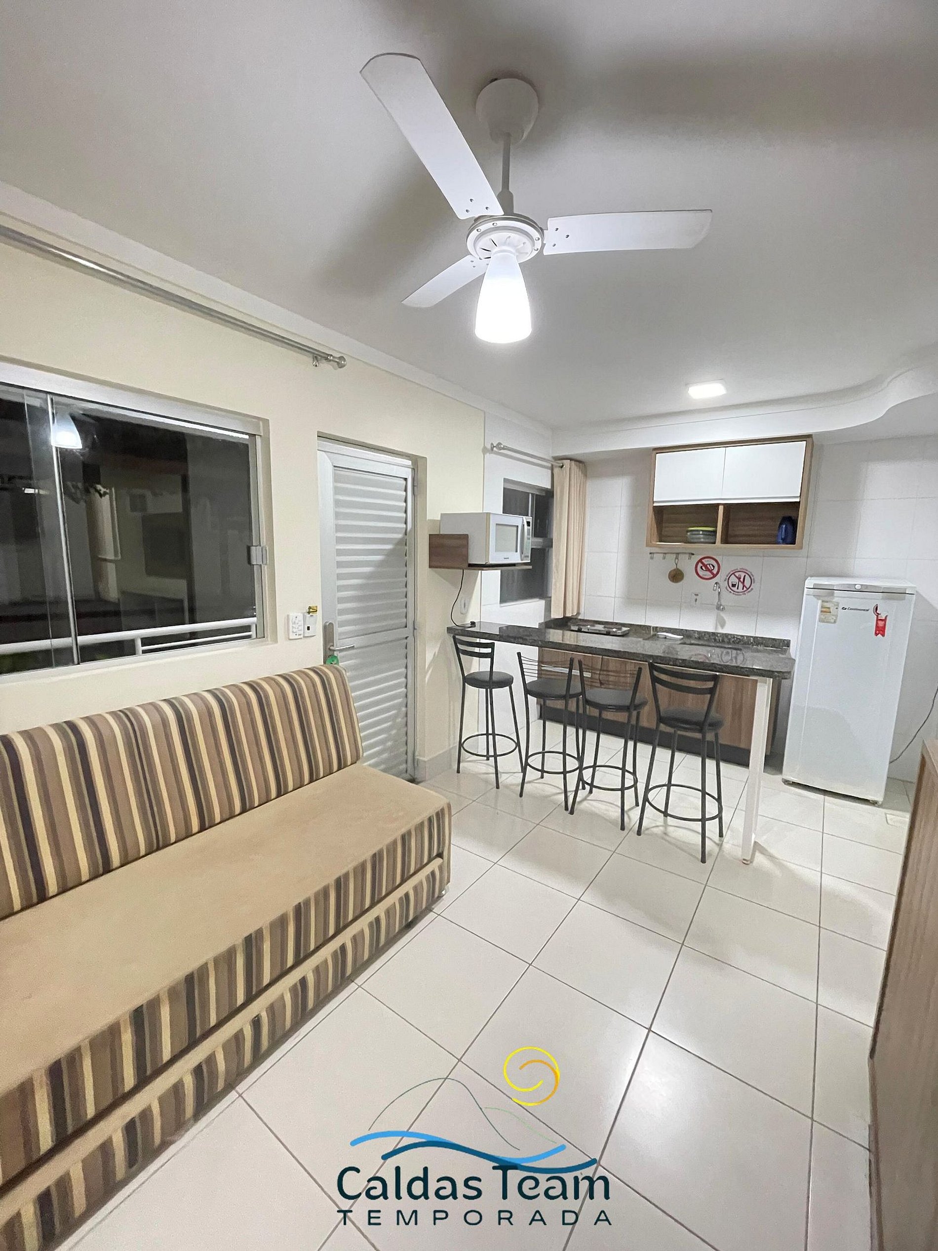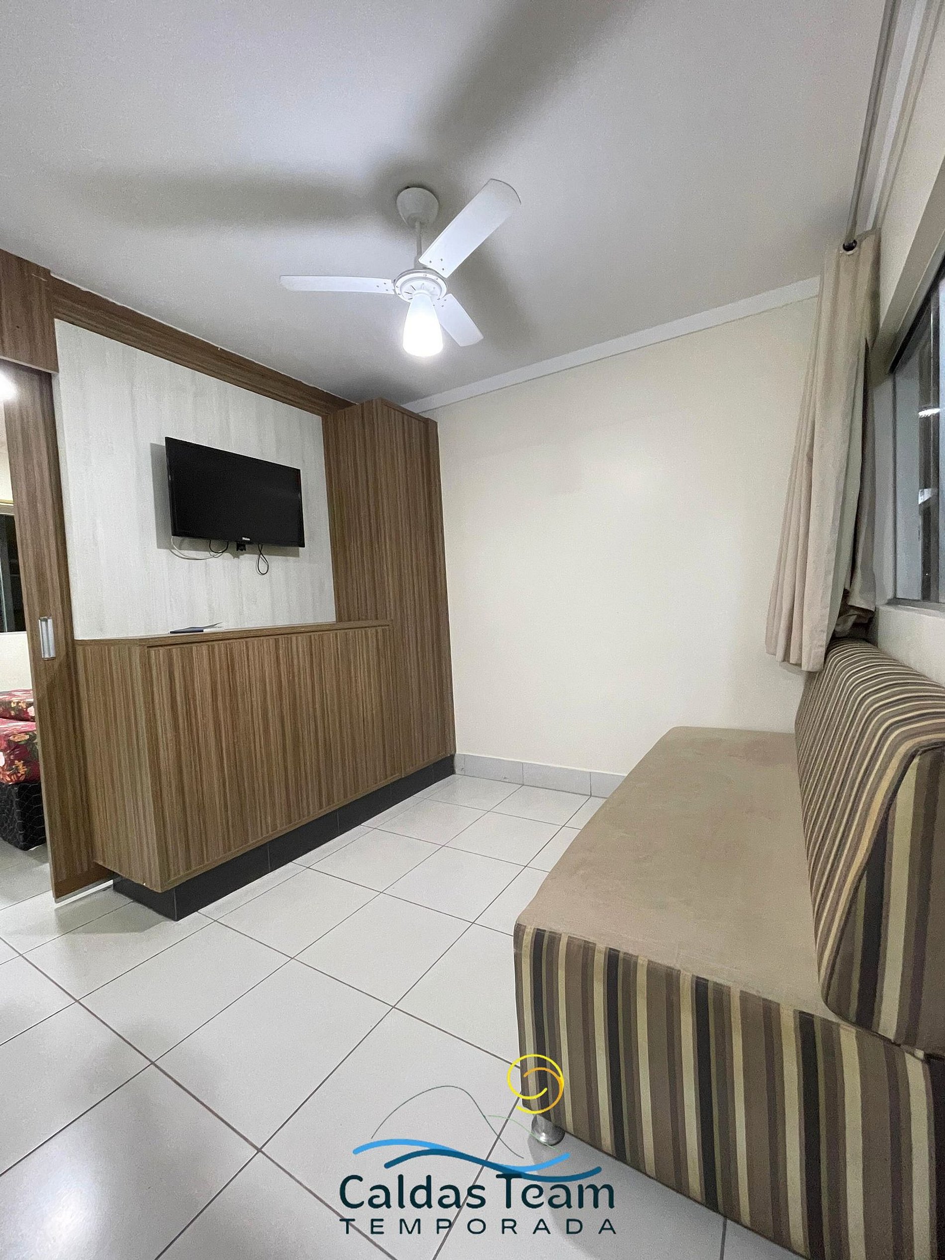 Sala com cama de casal, TV e ventilador de teto. Banheiro social. Frigobar e micro-ondas.