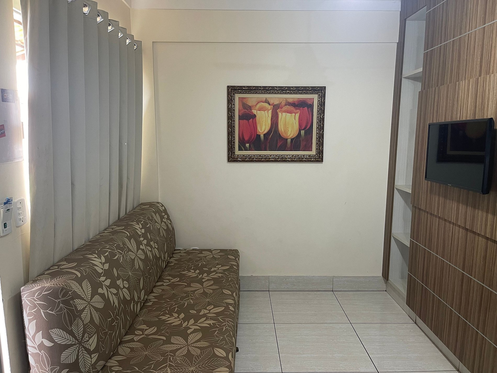Sala com cama de casal, TV e ventilador de teto. Banheiro social. Frigobar e micro-ondas.