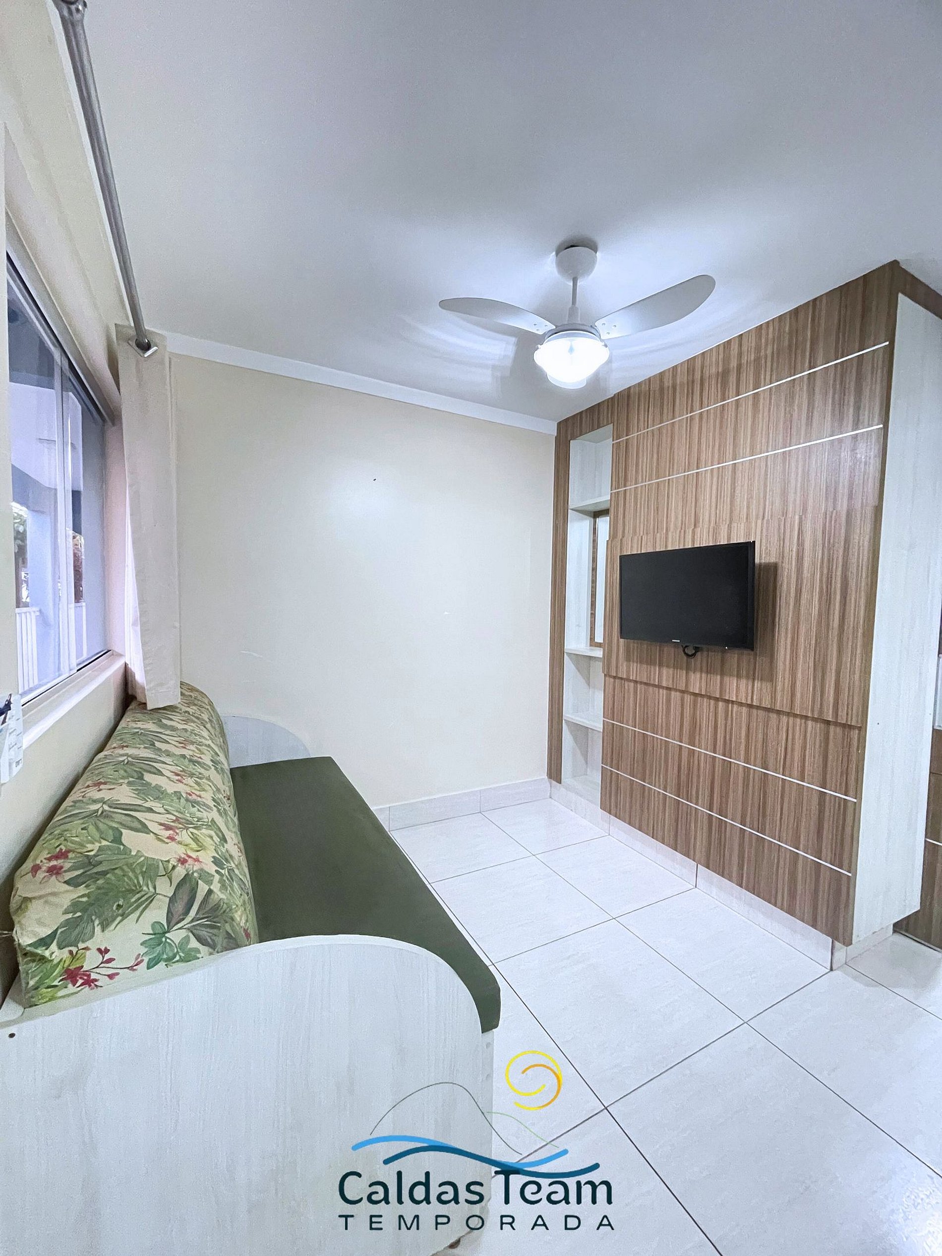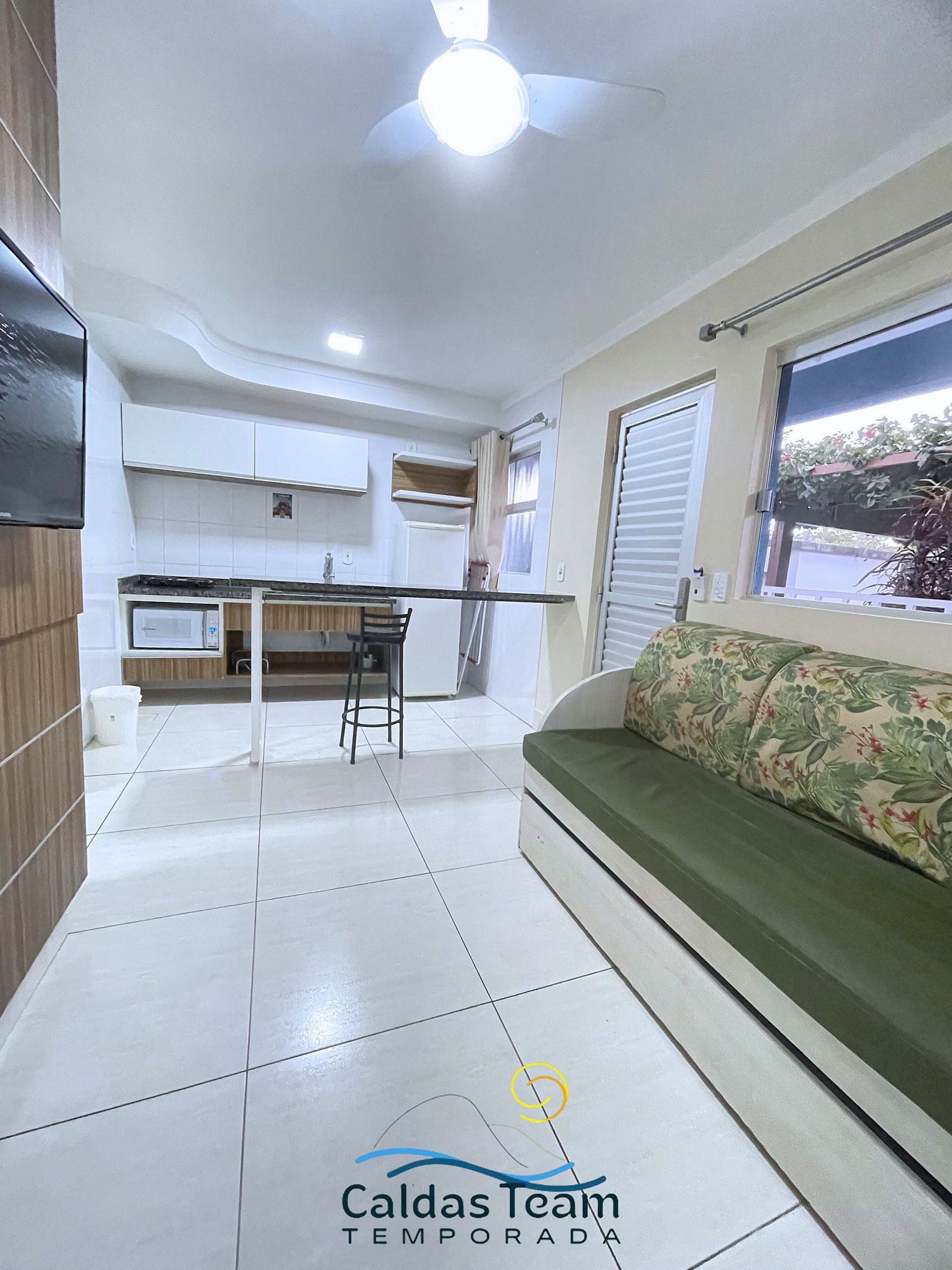 Sala com cama de casal, TV e ventilador de teto. Banheiro social. Frigobar e micro-ondas.