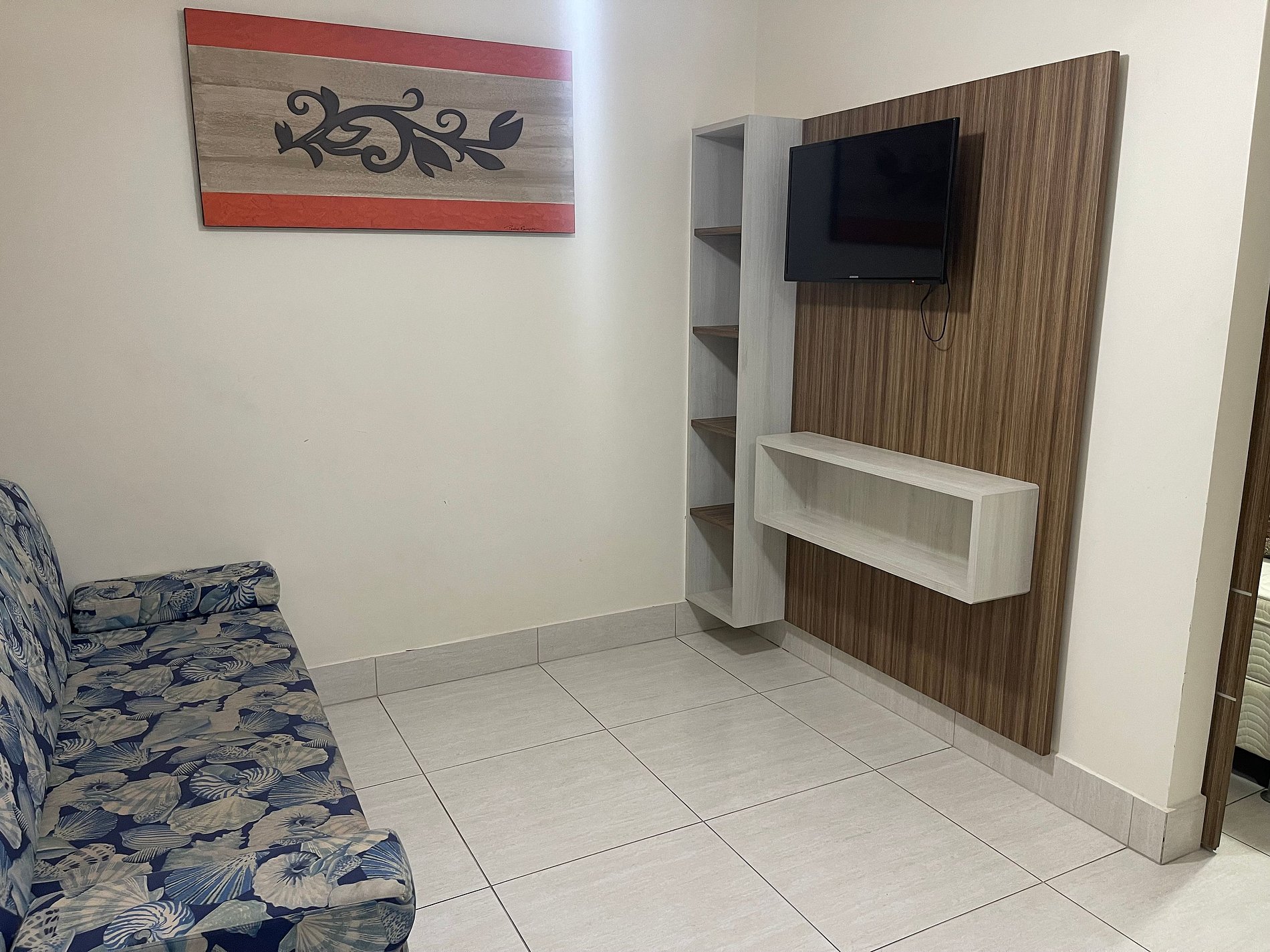 Sala com cama de casal, TV e ventilador de teto. Banheiro social. Frigobar e micro-ondas.