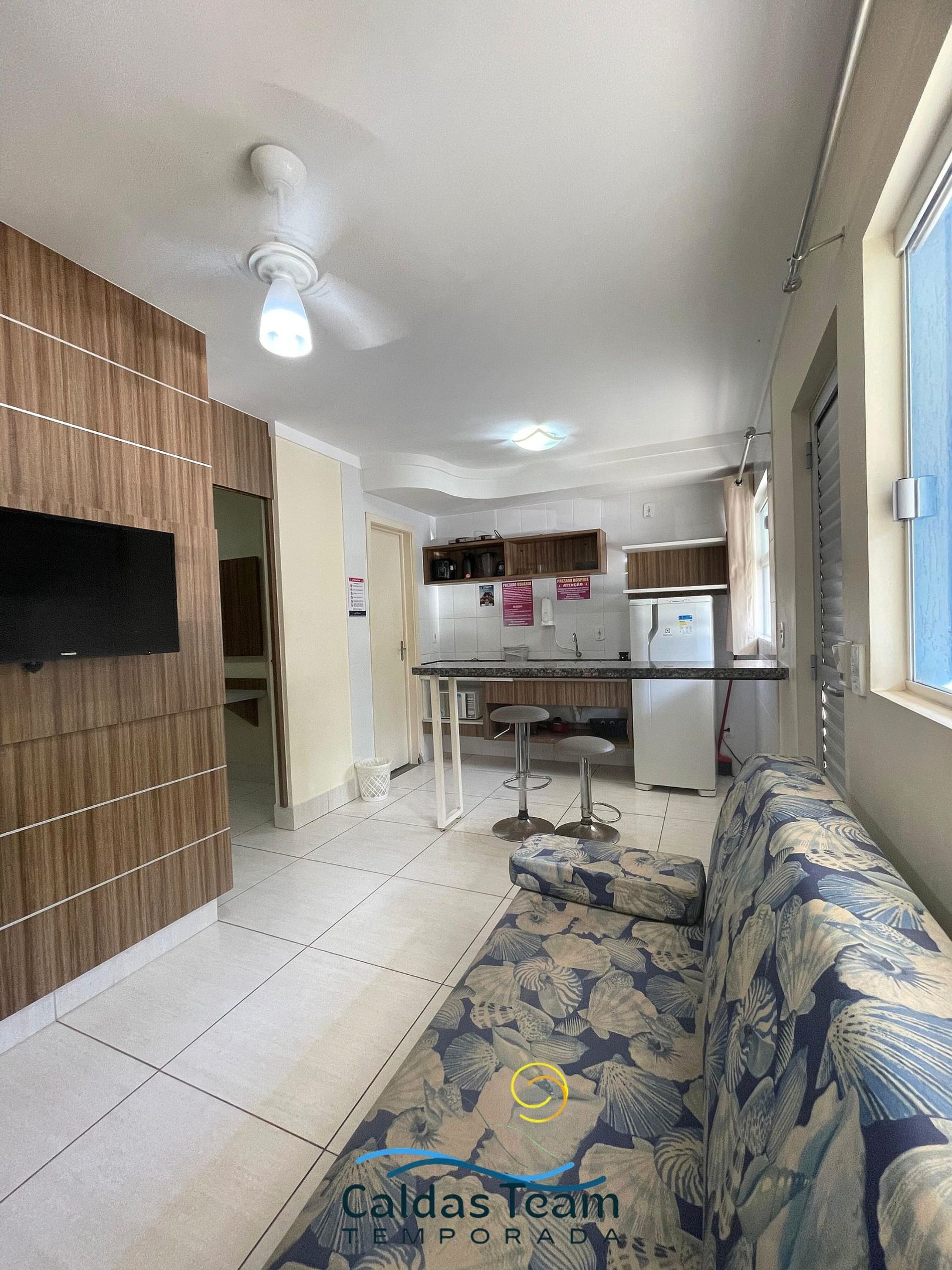 Sala com cama de casal, TV e ventilador de teto. Banheiro social. Frigobar e micro-ondas.