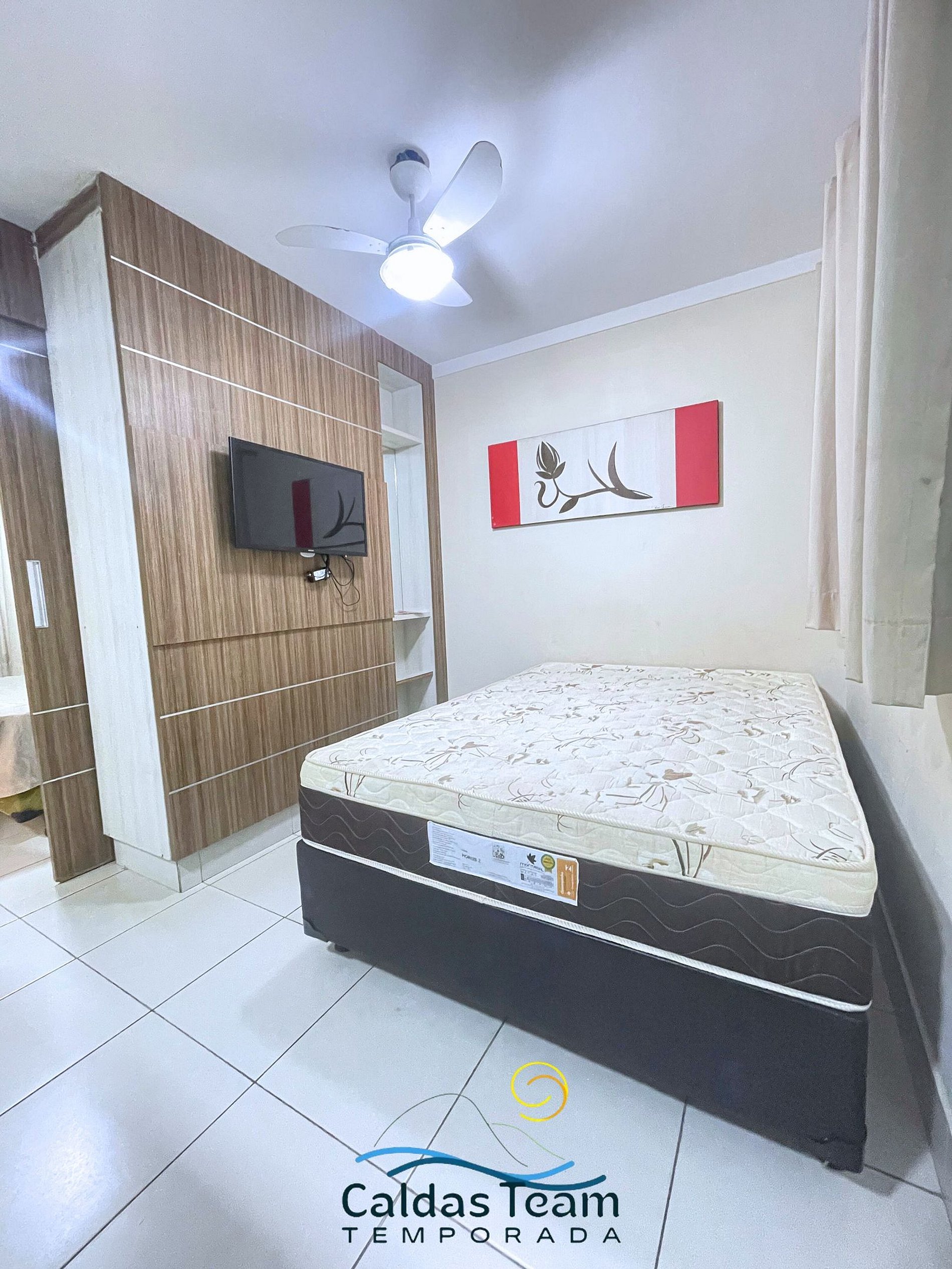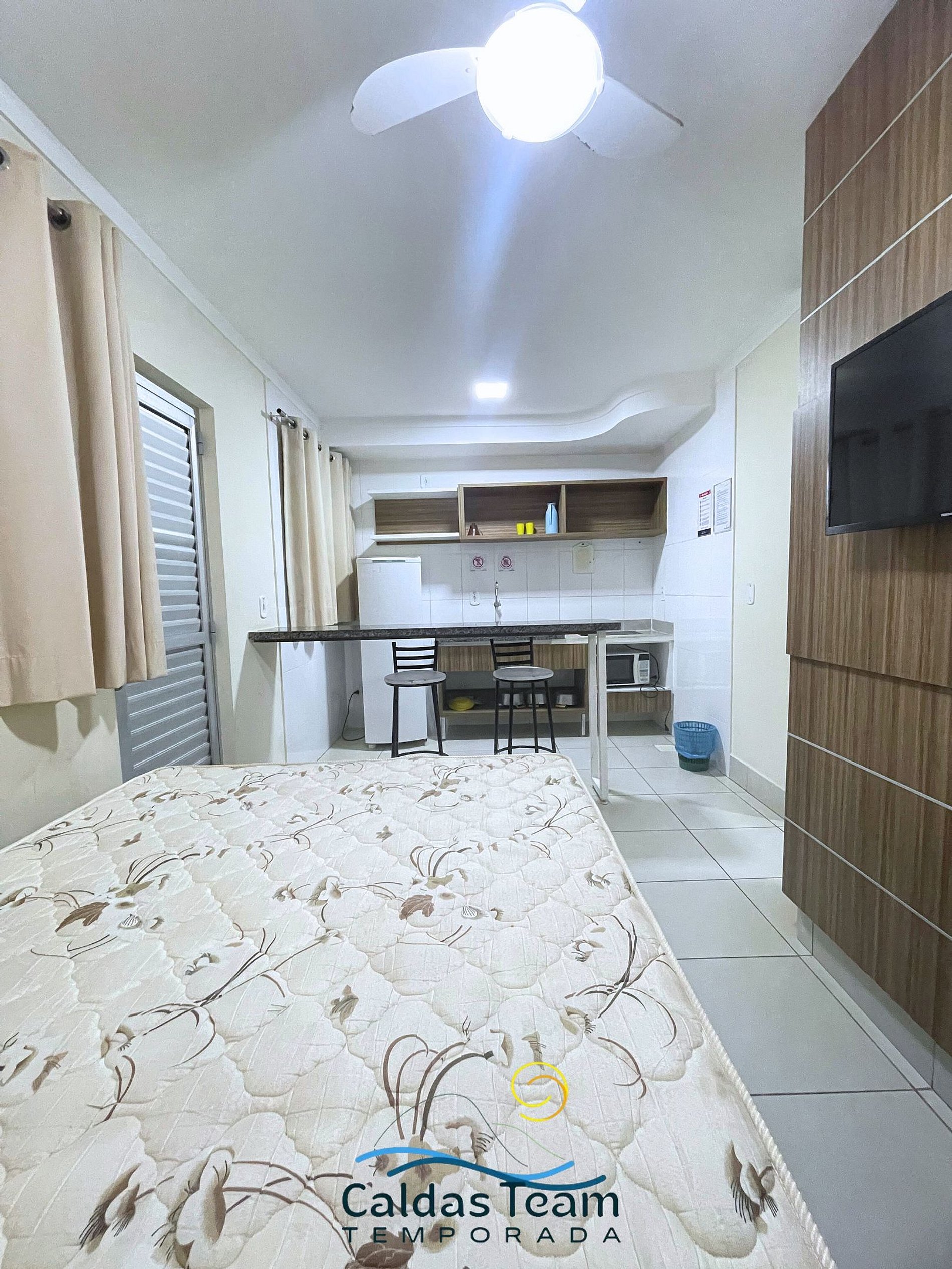 Sala com cama de casal, TV e ventilador de teto. Banheiro social. Frigobar e micro-ondas.