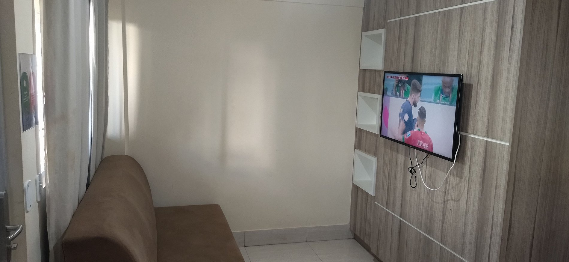 Sala com cama de casal, TV e ventilador de teto. Banheiro social. Frigobar e micro-ondas.