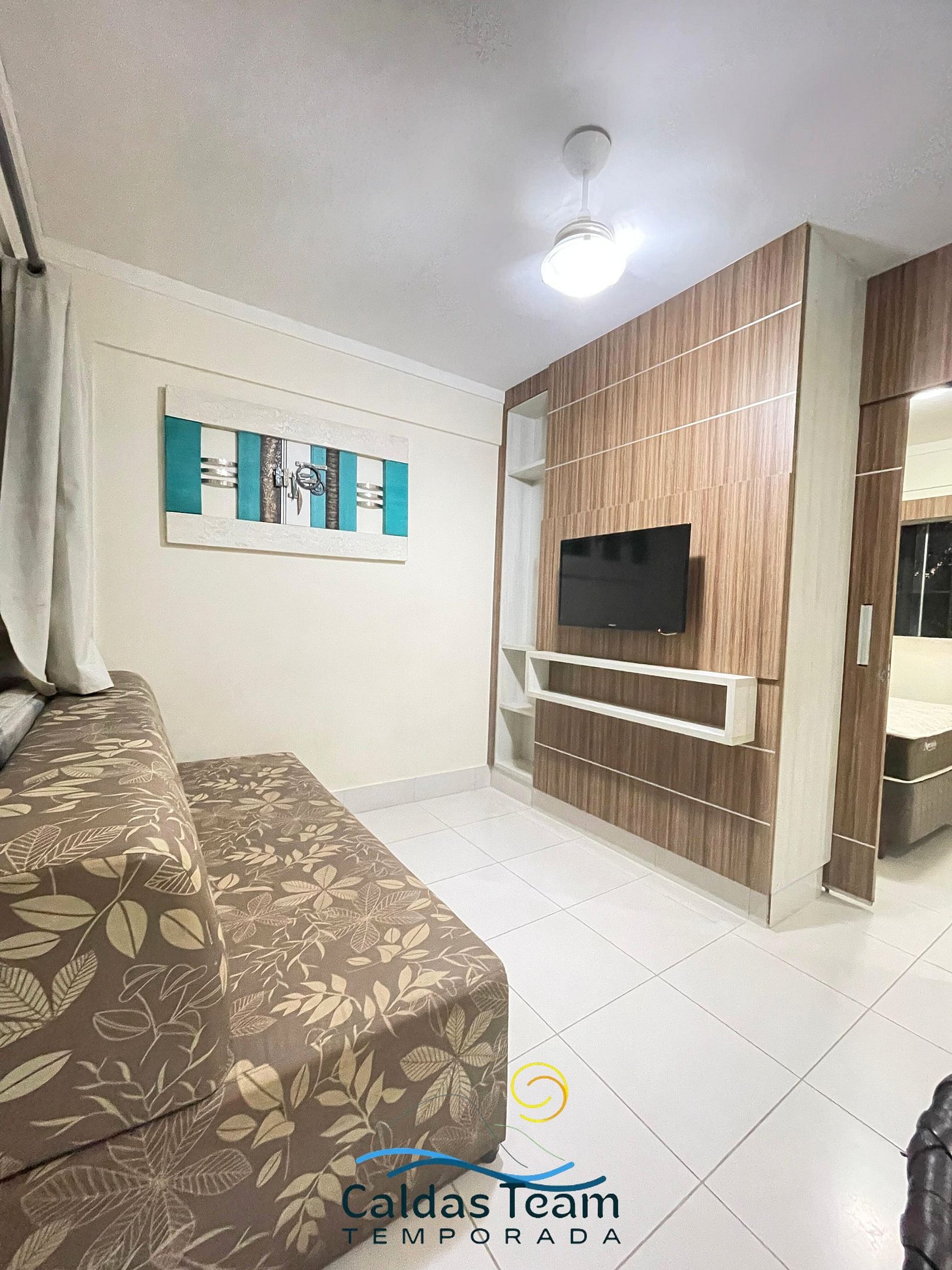 Sala com cama de casal, TV e ventilador de teto. Banheiro social. Frigobar e micro-ondas.