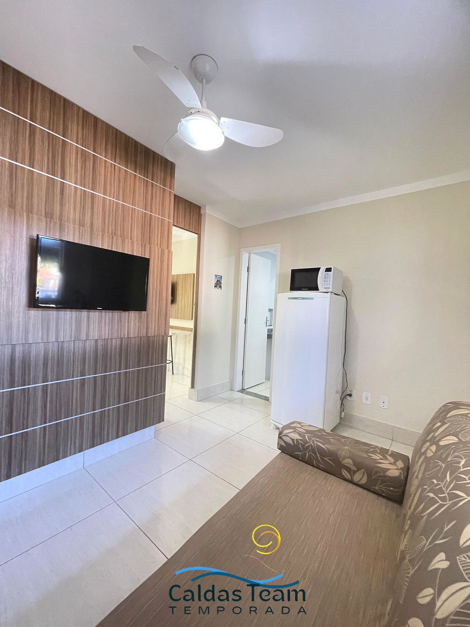 Sala com cama de casal, TV e ventilador de teto. Banheiro social. Frigobar e micro-ondas.