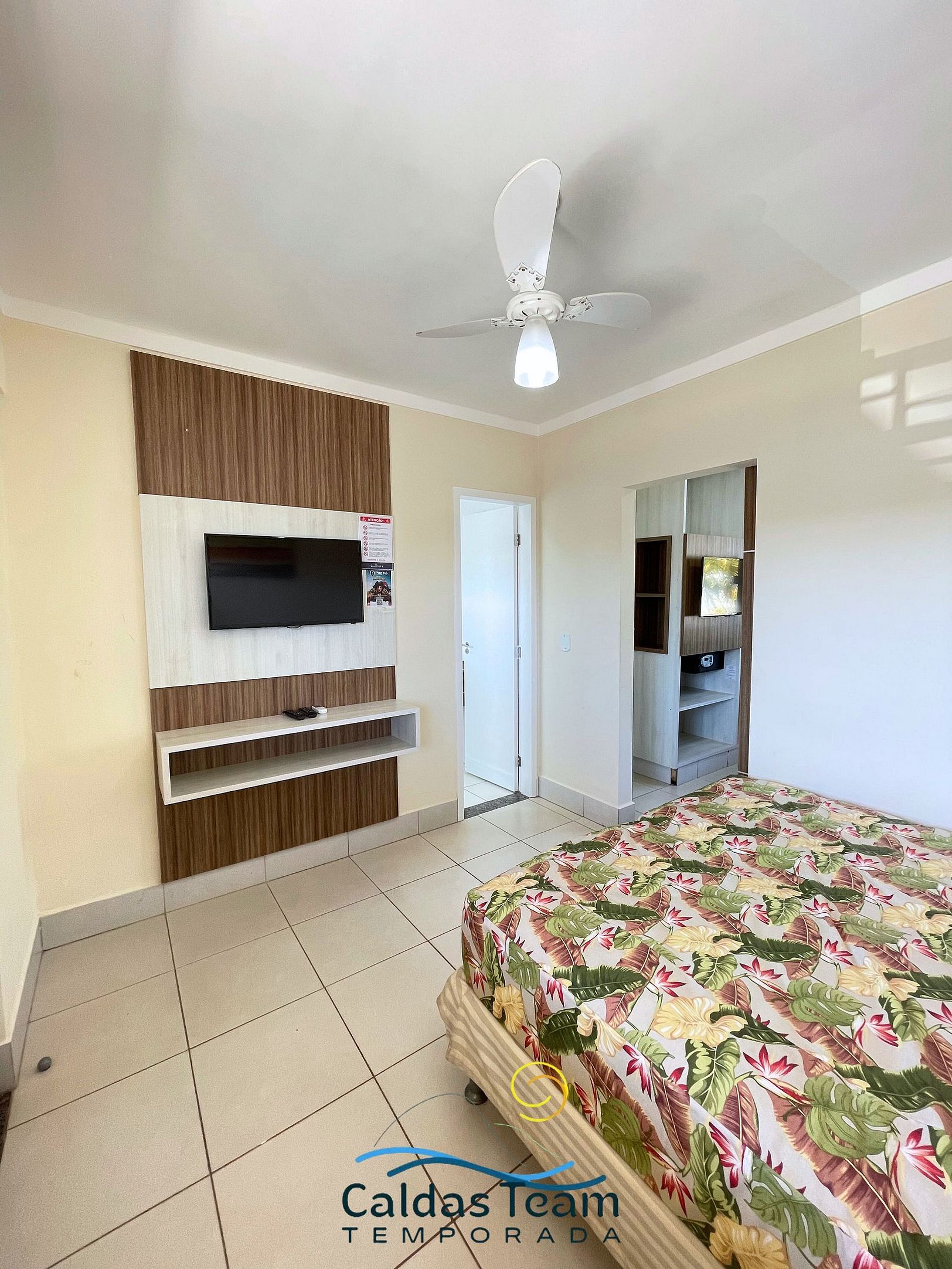 Sala com cama de casal, TV e ventilador de teto. Banheiro social. Frigobar e micro-ondas.
